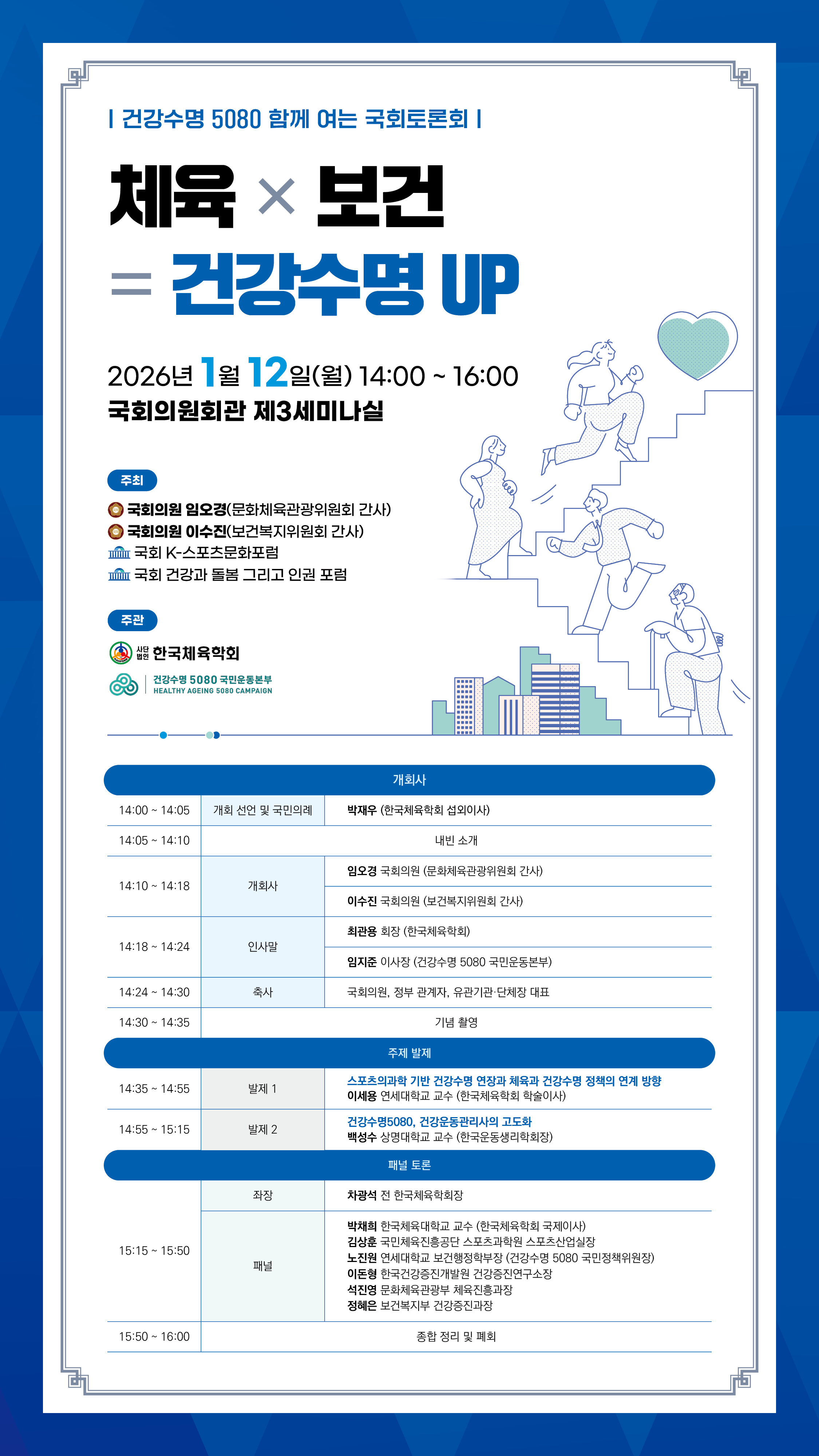 '건강수명 5080 함께 여는 국회 토론회: 체육 × 보건 = 건강수명 UP' 행사 안내