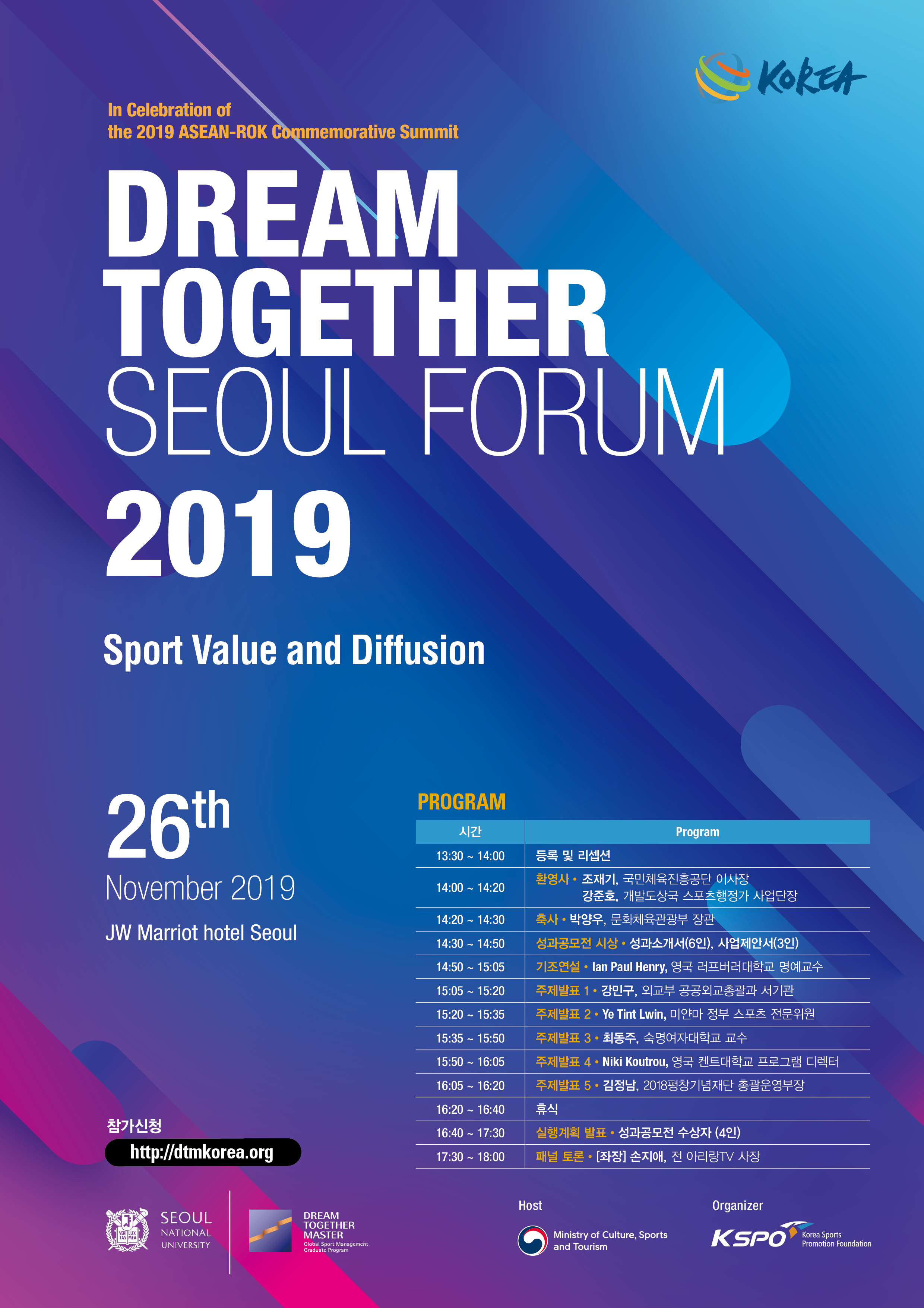 문화체육관광부와 국민체육체진흥공단은 스포츠 활동으로 인한 스포츠 가치 주제로 2019. 11.26(화) JW메리어트 호텔에서 '2019 드림 투게더 서울 포럼'을 개최합니다.