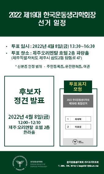 2022년 4월 8일(금) 제19대 한국운동생리학회장 선거가 진행됩니다.