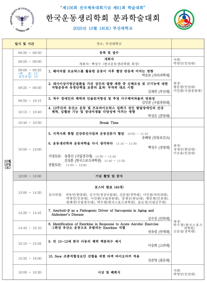 2.1. 전국체전기념 학술대회 : 18일(토) 한국운동생리학회 프로그램 안내