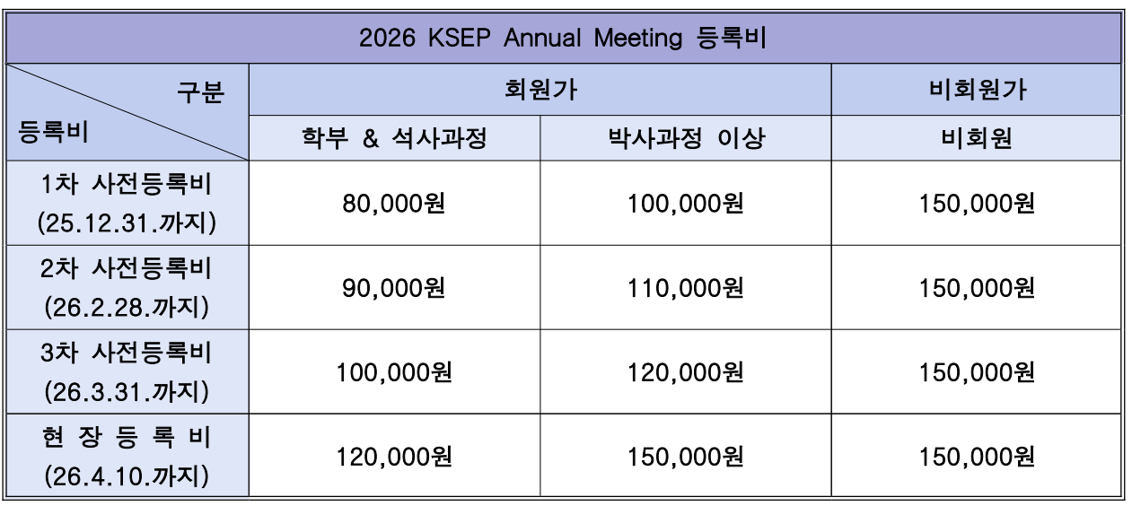 * 2026 KSEP Annual Meeting 등록비는 아래와 같습니다.